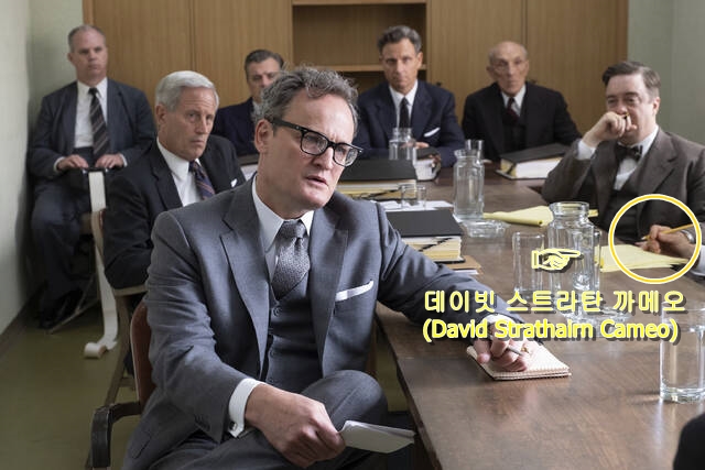 데이빗 스트라탄의 영화 속 까메오 출연은 오펜하이머 사건으로 잘 알려진 비공식 청문회 장면입니다.